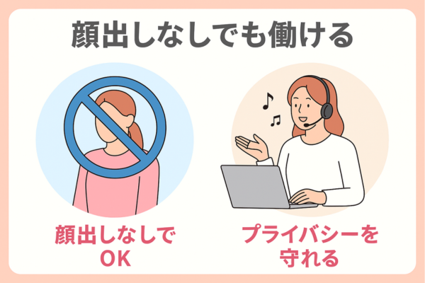 多くのサイトでは、顔出しなしでお仕事ができます。声だけで配信したり、目元・口元だけを見せてチャットする形式も一般的。