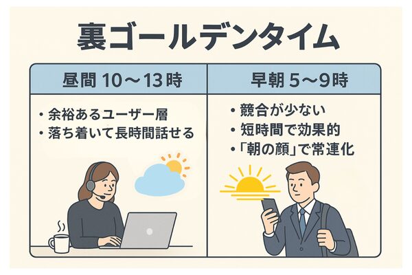 - 短時間で効果的:朝は時間が限られているため、テンポ良いやりとりが多め。たくさんのユーザーと接することができる